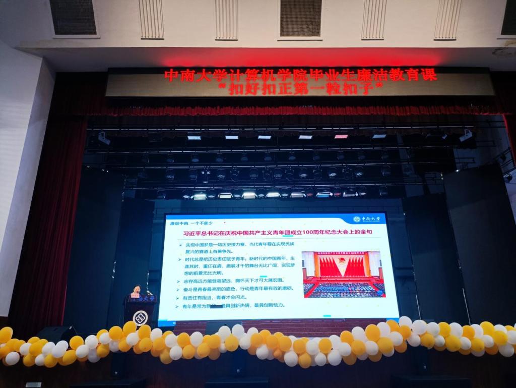 6月1下午6月2日下午,计算机学院在中南大学科教南楼305教室、新校区信息楼报告厅、铁道礼堂分三场开展“扣正扣好第一粒扣子”毕业生廉洁教育讲座。计算机学院本科2019级与研究生2020级全体同学参与。