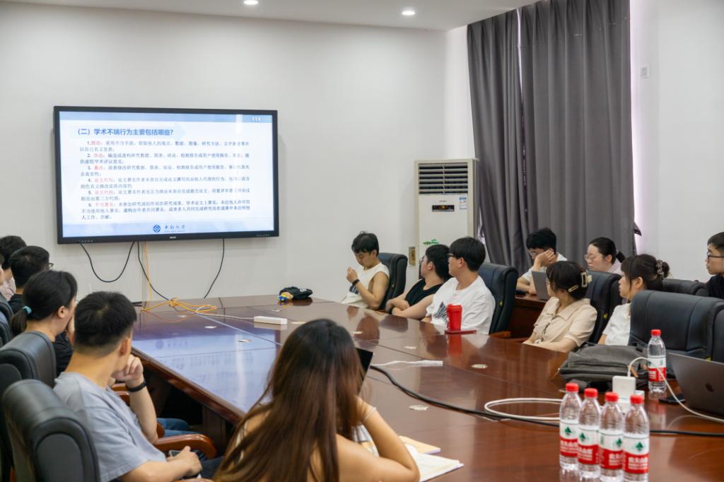 课上,赵明教授首先带领全体与会人员就研究生学术诚信与学术规范为主题进行了学习,对学术不端及科研失信事件进行了说明与原因分析,以及介绍了处理学术不端行为的具体方式。他就《高等学校预防与处理学术不端行为办法》、《中南大学预防和处理学术不端行为办法》、《中南大学科研诚信相关政策解读》等文件中的重点条目进行了解读。随后,他强调,科研诚信和学风建设是高校科研工作的重要保障,是关系到学校能否健康快速发展的重要因素,科研失信、学术不端行为背离了唯实求真的科学精神,严重挫伤科研人员创新积极性,损害学校学术生态环境,影响科学事业健康发展。